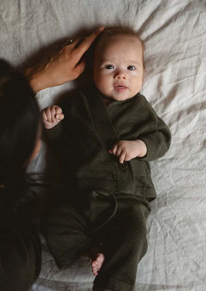 The collection offers a matching cardigan and pant set for mum and baby in khaki marle, accompanied by the Willow Blanket - a cosy essential to keep mum and baby warm in those tender moments. Finished with corozo nut buttons, the capsule is entirely plastic-free.
